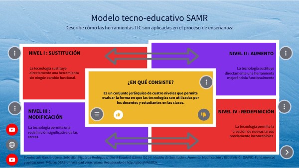 Fuente: Luis García-Utrera; Sebastián Figueroa-Rodríguez; Ismael Esquivel-Gámez (2014). Modelo de Sustitución, Aumento, Modificación y Redefinición (SAMR): Fundamentos y aplicaciones. México: DSAE-Universidad Veracruzana. Recuperado de http://goo.gl/WhDf2x