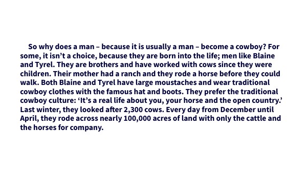 So why does a man – because it is usually a man – become a cowboy? For some, it isn’t a choice, because they are born into the life; men like Blaine and Tyrel. They are brothers and have worked with cows since they were children. Their mother had a ranch and they rode a horse before they could walk. Both Blaine and Tyrel have large moustaches and wear traditional cowboy clothes with the famous hat and boots. They prefer the traditional cowboy culture: ‘It’s a real life about you, your horse and the open country.’ Last winter, they looked after 2,300 cows. Every day from December until April, they rode across nearly 100,000 acres of land with only the cattle and the horses for company.