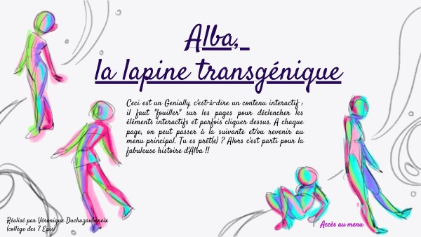 Ceci est un Genially, c'est-à-dire un contenu interactif : il faut "fouiller" sur les pages pour déclencher les éléments interactifs et parfois cliquer dessus. A chaque page, on peut passer à la suivante et/ou revenir au menu principal. Tu es prêt(e) ? Alors c'est parti pour la fabuleuse histoire d'Alba !!