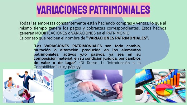 "Las VARIACIONES PATRIMONIALES son todo cambio, mutación o alteración producida en los elementos patrimoniales, activos y/o pasivos, ya sea en su composición material, en su condición jurídica, por cambios de valor o de lugar” (Di Russo, L; “Introducción a la Contabilidad”; 2015; pág. 39)