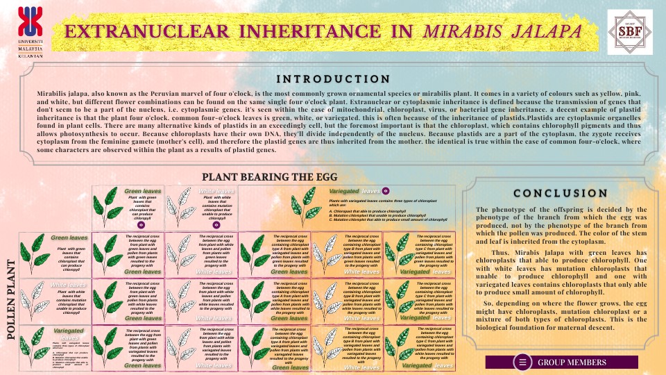 A reciprocal cross performed by white (female seed) and green Mirabilis (male seed) leaves. The progeny of the cross exhibited the same phenotypic as the female parent, white color. Thus, leaves color in Mirabilis is strictly inherited from the mother. Another, reciprocal cross performed by white (female seed) and white Mirabilis (male seed) leaves. Same as above, the progeny has the same color as the female parent which is white leaves. Variegated leaves from male seed and white leaves from female seed are shown the reciprocal cross. As a result, their inheritance is white leaves.