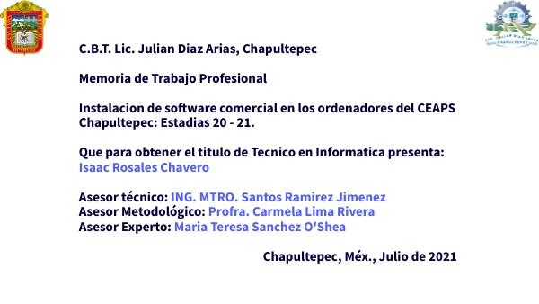 C.B.T. Lic. Julian Diaz Arias, Chapultepec Memoria de Trabajo Profesional Instalacion de software comercial en los ordenadores del CEAPS Chapultepec: Estadias 20 - 21. Que para obtener el titulo de Tecnico en Informatica presenta: Isaac Rosales Chavero Asesor técnico: ING. MTRO. Santos Ramirez Jimenez Asesor Metodológico: Profra. Carmela Lima Rivera Asesor Experto: Maria Teresa Sanchez O'Shea