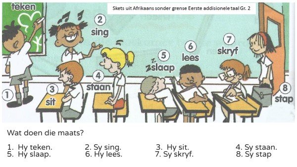 Wat doen die maats?1. Hy teken. 2. Sy sing. 3. Hy sit. 4. Sy staan. 5. Hy slaap. 6. Hy lees. 7. Sy skryf. 8. Sy stap