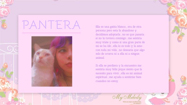 Ella es una gatita blanca , era de otra persona pero esta la abandono y decidimos adoptarla , no se que pasaria si no la tuviera conmigo , me sentiria muy triste y como si una gran parte de mi se ha ido , ella lo es todo y la amo con toda mi vida , no desearia que algo mlo de ocurra ni a ella ni a ningun animal. Si ella se perdiera y la encuentro me sentiria muy feliz prque siento que la necesito para vivir , ella es mi animal espiritual , me ayuda a sentirme bien cuandoo no estoy.