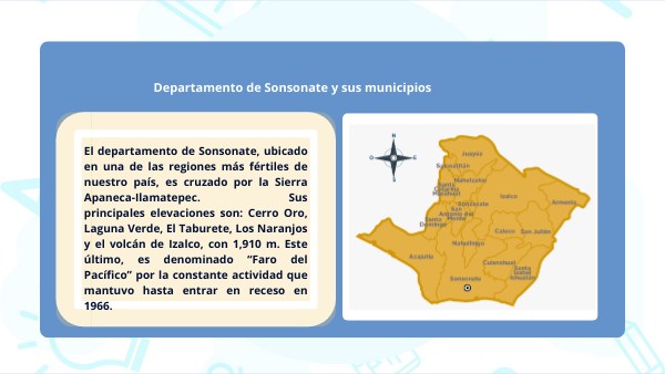 El departamento de Sonsonate, ubicado en una de las regiones más fértiles de nuestro país, es cruzado por la Sierra Apaneca-Ilamatepec. Sus principales elevaciones son: Cerro Oro, Laguna Verde, El Taburete, Los Naranjos y el volcán de Izalco, con 1,910 m. Este último, es denominado “Faro del Pacífico” por la constante actividad que mantuvo hasta entrar en receso en 1966.