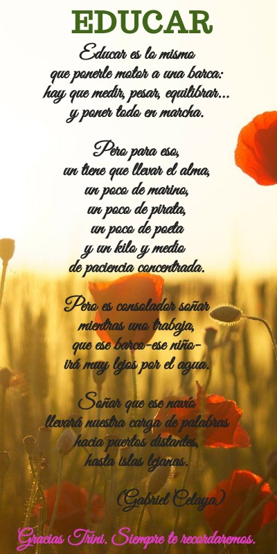 Educar es lo mismoque ponerle motor a una barca: hay que medir, pesar, equilibrar... y poner todo en marcha. Pero para eso, un tiene que llevar el alma, un poco de marino, un poco de pirata, un poco de poeta y un kilo y medio de paciencia concentrada. Pero es consolador soñar mientras uno trabaja, que ese barco-ese niño- irá muy lejos por el agua. Soñar que ese navío llevará nuestra carga de palabras hacia puertos distantes, hasta islas lejanas. (Gabriel Celaya) Gracias Trini. Siempre te recordaremos.