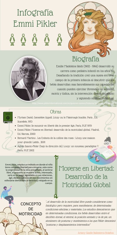 Emilie Madeleine Reich (1902 - 1984) desarrolló su carrera como pediatra infantil en los años 30. Desafiando la tradición creó una nueva era en el campo de la primera infancia al descubrir que los bebés desarrollan mas favorablemente sus capacidades cuando pueden ejercitar libremente su actividad motriz y lúdica, sin la intervención directa del adulto y siguiendo su ritmo individual.