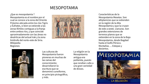 ¿Que es mesopotamia ?Mesopotamia es el nombre por el cual se conoce a la zona del Oriente Próximo ubicada entre los ríos Tigris y Éufrates, si bien se extiende a las zonas fértiles contiguas a la franja entre ambos ríos, y que coincide aproximadamente con las áreas no desérticas del actual Irak y la zona limítrofe del norte-este de Siria. Wikipedia Regiones