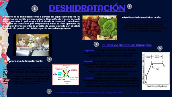 Consiste en la eliminación total o parcial del agua contenida en los alimentos por acción del aire caliente. Operación de transferencia de masa de contacto sólido- gas (aire), donde la humedad contenida en el sólido se transfiere por evaporación hacia la fase gaseosa, en base a la diferencia entre la presión de vapor ejercida por el sólido húmedo y la presión parcial de vapor de la corriente gaseosa