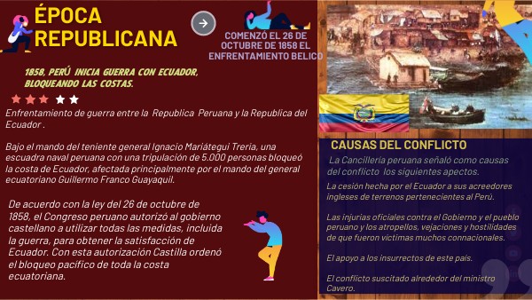 Enfrentamiento de guerra entre la Republica Peruana y la Republica del Ecuador . Bajo el mando del teniente general Ignacio Mariátegui Treria, una escuadra naval peruana con una tripulación de 5.000 personas bloqueó la costa de Ecuador, afectada principalmente por el mando del general ecuatoriano Guillermo Franco Guayaquil.