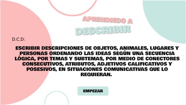 Escribir descripciones de objetos, animales, lugares y personas ordenando las ideas según una secuencia lógica, por temas y subtemas, por medio de conectores consecutivos, atributos, adjetivos calificativos y posesivos, en situaciones comunicativas que lo requieran.