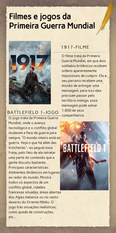 O jogo trata da Primeira Guerra Mundial, onde o avanço tecnológico e o conflito global mudaram a face da guerra para sempre. “O mundo inteiro está em guerra. Veja o que há além das trincheiras"- eu peguei essa frase, pelo fato de ela retratar uma parte do conteúdo que a gente discutiu bastante. Principais características: Ambientes dinâmicos em lugares ao redor do mundo. Mostra todos os aspectos de um conflito global, cidades francesas situadas, áreas abertas dos Alpes italianos ou no vasto deserto do Oriente Médio. O jogo trás situações realísticas, como queda de construções, etc…