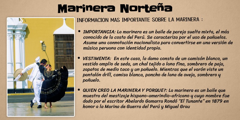 IMPORTANCIA: La marinera es un baile de pareja suelta mixta, el más conocido de la costa del Perú. Se caracteriza por el uso de pañuelos. Asume una connotación nacionalista para convertirse en una versión de música peruana con identidad propia.