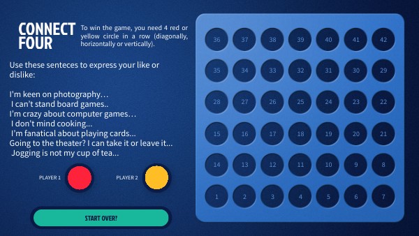 CONNECT FOUR GAME - Expressing likes and dislikes hobbys