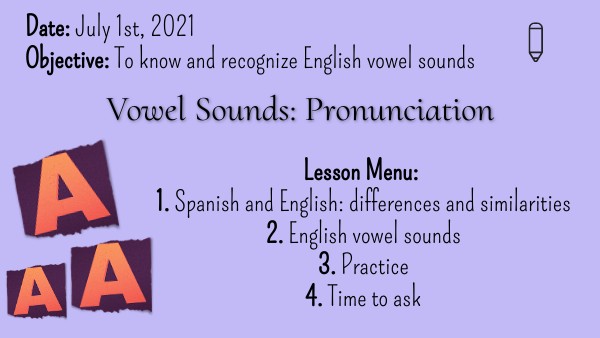 Date: July 1st, 2021Objective: To know and recognize English vowel sounds