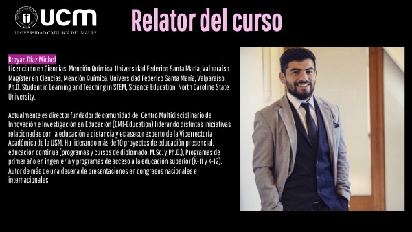 Brayan Díaz Michel Licenciado en Ciencias, Mención Química, Universidad Federico Santa María, Valparaíso. Magíster en Ciencias, Mención Química, Universidad Federico Santa María, Valparaíso. Ph.D. Student in Learning and Teaching in STEM, Science Education, North Caroline State University. Actualmente es director fundador de comunidad del Centro Multidisciplinario de Innovación e Investigación en Educación (CMI-Education) liderando distintas iniciativas relacionadas con la educación a distancia y es asesor experto de la Vicerrectoría Académica de la USM. Ha liderando más de 10 proyectos de educación presencial, educación continua (programas y cursos de diplomado, M.Sc. y Ph.D.), Programas de primer año en ingeniería y programas de acceso a la educación superior (K-11 y K-12). Autor de más de una decena de presentaciones en congresos nacionales e internacionales.