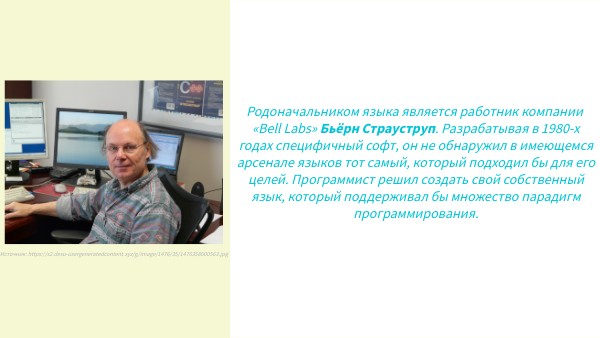 Родоначальником языка является работник компании «Bell Labs» Бьёрн Страуструп. Разрабатывая в 1980-х годах специфичный софт, он не обнаружил в имеющемся арсенале языков тот самый, который подходил бы для его целей. Программист решил создать свой собственный язык, который поддерживал бы множество парадигм программирования.
