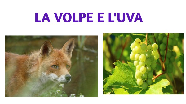 Dai tralci della vite pendevano grossi grappoli d'uva; gli acini erano dolci, succosi e molto invitanti. La volpe si sollevò sulle zampe posteriori per prendere qualche grappolo ,ma era talmente bassa da non riuscire a sfiorare gli acini.