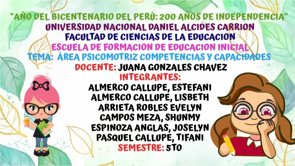 "AÑO DEL BICENTENARIO DEL PERÚ: 200 AÑOS DE INDEPENDENCIA" UNIVERSIDAD NACIONAL DANIEL ALCIDES CARRION FACULTAD DE CIENCIAS DE LA EDUCACION ESCUELA de formacion DE EDUCACION INICIAL TEMA: Área Psicomotriz competencias y capacidades DOCENTE: juana gonzales chavez INTEGRANTES: almerco callupe, estefani ALMERCO CALLUPE, LISBETH ARRIETA ROBLES EVELYN campos meza, shunmy espinoza anglas, joselyn PASQUEL CALLUPE, TIFANI SEMESTRE: 5TO
