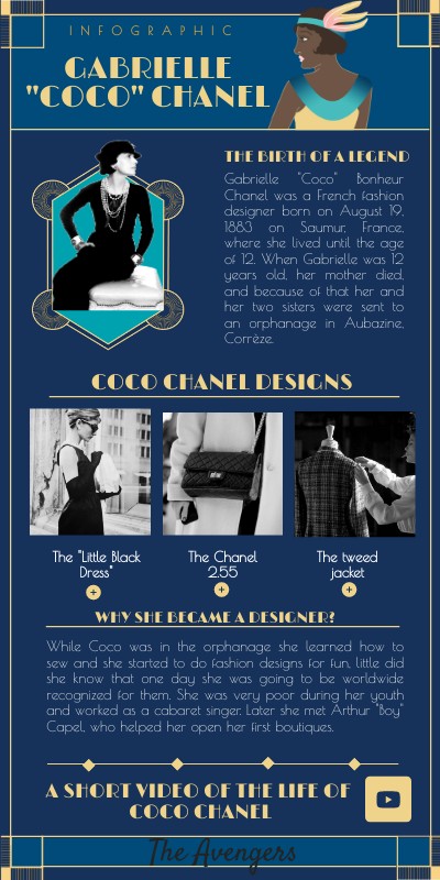 Gabrielle "Coco" Bonheur Chanel was a French fashion designer born on August 19, 1883 on Saumur, France, where she lived until the age of 12. When Gabrielle was 12 years old, her mother died, and because of that her and her two sisters were sent to an orphanage in Aubazine, Corrèze.