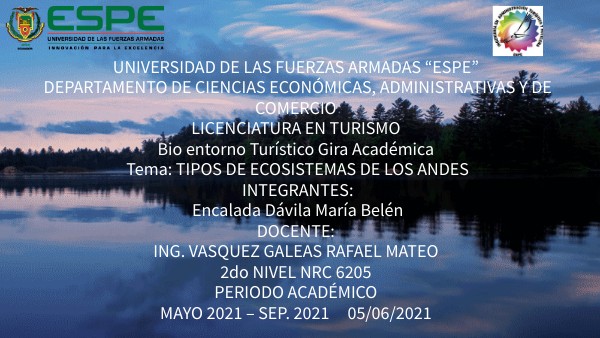 UNIVERSIDAD DE LAS FUERZAS ARMADAS “ESPE” DEPARTAMENTO DE CIENCIAS ECONÓMICAS, ADMINISTRATIVAS Y DE COMERCIO LICENCIATURA EN TURISMO Bio entorno Turístico Gira Académica Tema: TIPOS DE ECOSISTEMAS DE LOS ANDES INTEGRANTES: Encalada Dávila María Belén DOCENTE: ING. VASQUEZ GALEAS RAFAEL MATEO 2do NIVEL NRC 6205 PERIODO ACADÉMICO MAYO 2021 – SEP. 2021 05/06/2021