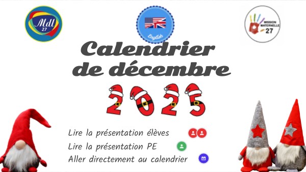Bonjour, Les Missions Maitrise de la langue 27, Maternelle 27 et Langues vivantes 27 vous proposent un nouveau Calendrier de Décembre pour égrener les jours avant les fêtes de fin d’année en réalisant des activités éducatives et ludiques. Comme l’an passé, les mercredis et week-end, vous pourrez partager des activités avec les familles en leur envoyant ce lien vers un support spécifiquement créé pour ce partage. Nous savons que vous êtes nombreuses, nombreux à utiliser ce calendrier chaque année, aussi nous permettons-nous de vous demander d'indiquer le nom de votre école et le nombre de classes l'utilisant dans ce document en ligne afin que nous ayons une vision quantitative du projet en cette année 2025. Le tableau est ici, merci. Merci à Nathalie Beugin, CPC Pont Audemer Ouest, Sophie Véron, CPC ASH, à Muriel Ourry, CPC Etrépagny, pour leur participation active à la conception et à Mme BASTIEN, IEN MDL, à Mme JADART, IEN pré-élémentaire et à Mme Bocquiault-Boulay, IEN LV, pour leur confiance.