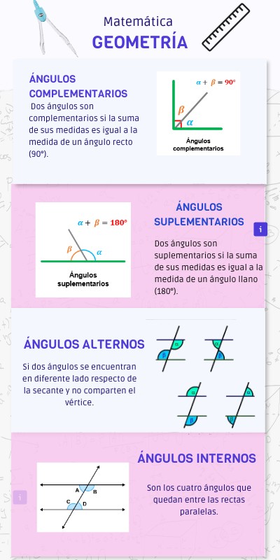 Dos ángulos son complementarios si la suma de sus medidas es igual a la medida de un ángulo recto (90°).