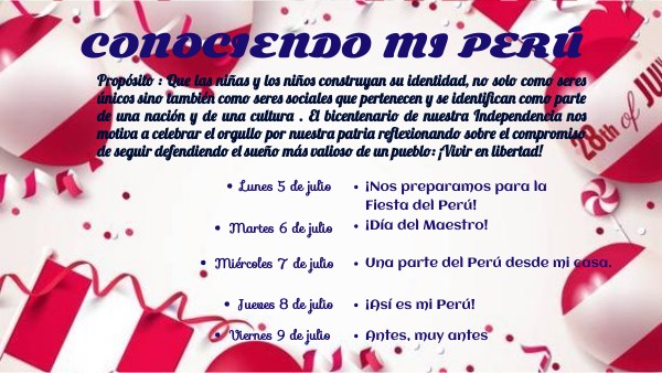 Propósito : Que las niñas y los niños construyan su identidad, no solo como seres únicos sino también como seres sociales que pertenecen y se identifican como parte de una nación y de una cultura . El bicentenario de nuestra Independencia nos motiva a celebrar el orgullo por nuestra patria reflexionando sobre el compromiso de seguir defendiendo el sueño más valioso de un pueblo: ¡Vivir en libertad!