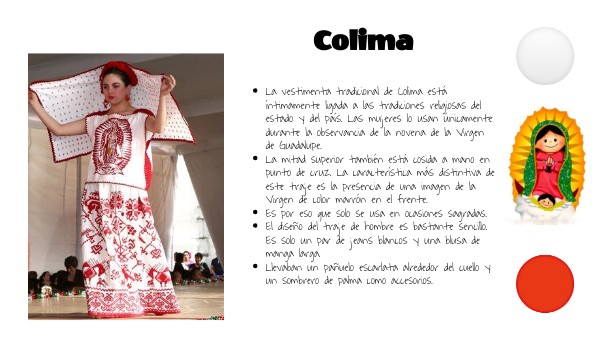 - La vestimenta tradicional de Colima está íntimamente ligada a las tradiciones religiosas del estado y del país. Las mujeres lo usan únicamente durante la observancia de la novena de la Virgen de Guadalupe.