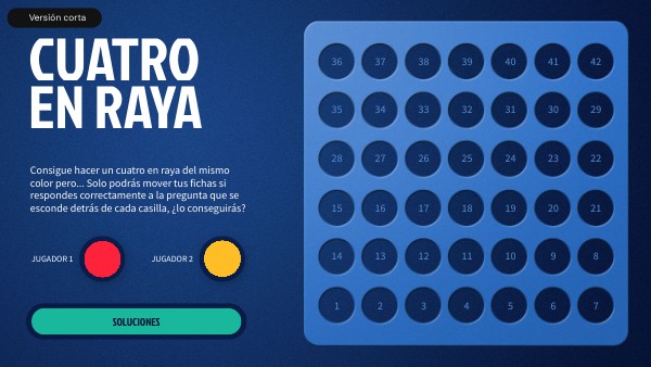 Consigue hacer un cuatro en raya del mismo color pero... Solo podrás mover tus fichas si respondes correctamente a la pregunta que se esconde detrás de cada casilla, ¿lo conseguirás?