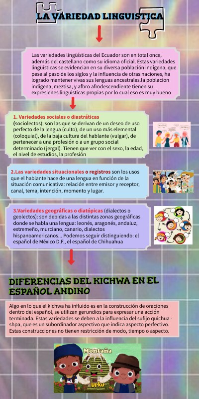 Las variedades lingüísticas del Ecuador son en total once, además del castellano como su idioma oficial. Estas variedades lingüísticas se evidencian en su diversa población indígena, que pese al paso de los siglos y la influencia de otras naciones, ha logrado mantener vivas sus lenguas ancestrales.la poblacion indigena, meztisa, y afbro afrodescendiente tienen su expresienes linguisticas propias por lo cual eso es muy bueno