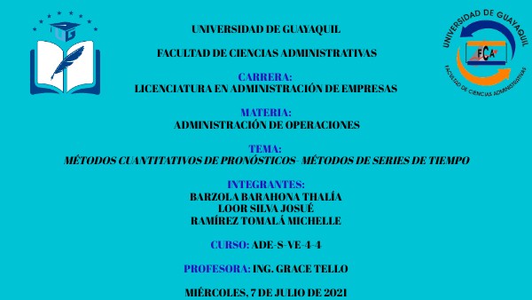 UNIVERSIDAD DE GUAYAQUIL FACULTAD DE CIENCIAS ADMINISTRATIVAS CARRERA: LICENCIATURA EN ADMINISTRACIÓN DE EMPRESAS MATERIA: ADMINISTRACIÓN DE OPERACIONES TEMA: MÉTODOS CUANTITATIVOS DE PRONÓSTICOS- MÉTODOS DE SERIES DE TIEMPO INTEGRANTES: BARZOLA BARAHONA THALÍA LOOR SILVA JOSUÉ RAMÍREZ TOMALÁ MICHELLE CURSO: ADE-S-VE-4-4 PROFESORA: ING. GRACE TELLO MIÉRCOLES, 7 DE JULIO DE 2021