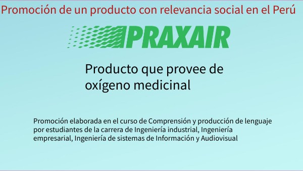 Praxair es una empresa en la industria química dedicada a proveer de gases industriales en América del Norte y del Sur y una de las más importantes a nivel mundial. Praxair prevé que la industria en el Perú sea favorable y pueda ayudar a que sus clientes encuentren soluciones eficientes y a su vez creen valor siendo sostenibles con el medio ambiente. El oxígeno medicinal Praxair es un medicamento altamente recomendado para disminuir los contagios y a su vez se ha convertido en un producto de primera necesidad por su eficacia al tratar con pacientes en estado crítico.