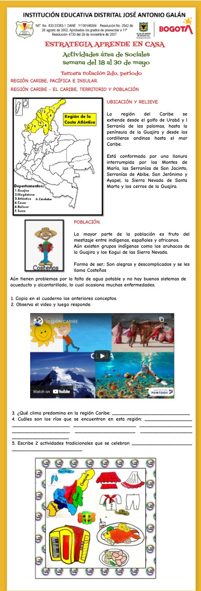 3. ¿Qué clima predomina en la región Caribe: ______________________________ 4. Cuáles son los ríos que se encuentran en esta región: __________________, ______________________, ________________________, ____________________, ______________________, _______________________, ____________________ ______________________ 5. Escribe 2 actividades tradicionales que se celebran _______________________, ___________________________.