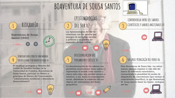 Para Boaventura de Sousa San- tos salvar nuestro planeta requiere ir más allá del marco de referencia eurocéntrico, reconociendo la pluralidad de modos de adquisición de conocimiento (que incluye el conocimiento científico), lo que Boaventura de Sousa Santos llamó las Episte- mologías del Sur.