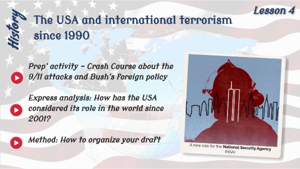 Prep' activity - Crash Course about the 9/11 attacks and Bush's foreign policy Express analysis: How has the USA considered its role in the world since 2001? Method: How to organize your draft