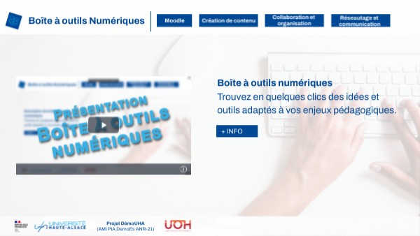 La Boîte à outils numériques du projet DémoUHA La Boîte à outils numériques, développée dans le cadre du projet UHA++, s'inscrit dans une démarche de continuité au sein du groupe de travail "Espaces d'apprentissages numériques" du projet DémoUHA. Son objectif est d'accompagner les utilisateurs tout en étant facilement accessible et libre de droits, sous licence Creative Commons non-commercialisable. Suite à un questionnaire mené au sein de l'Université, il est apparu un intérêt marqué pour la mise à jour des tutoriels existants et l'ajout de nouveaux outils surtout des outils "Moodle". Cette évolution vise à mieux répondre aux besoins pédagogiques et techniques des différents utilisateurs.
