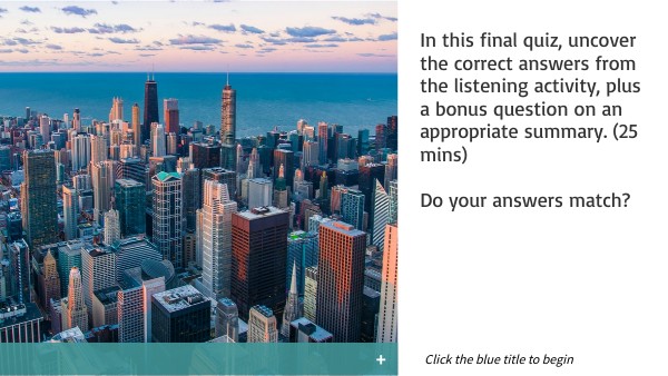 In this final quiz, uncover the correct answers from the listening activity, plus a bonus question on an appropriate summary. (25 mins) Do your answers match?
