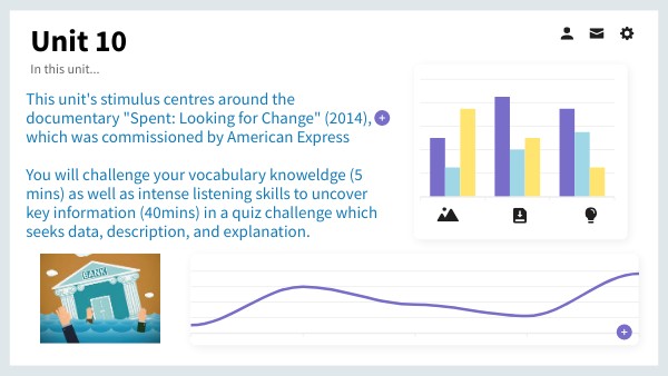 This unit's stimulus centres around the documentary "Spent: Looking for Change" (2014), which was commissioned by American Express You will challenge your vocabulary knoweldge (5 mins) as well as intense listening skills to uncover key information (40mins) in a quiz challenge which seeks data, description, and explanation.