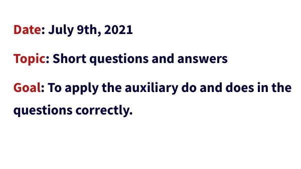 Date: July 9th, 2021Topic: Short questions and answers Goal: To apply the auxiliary do and does in the questions correctly.