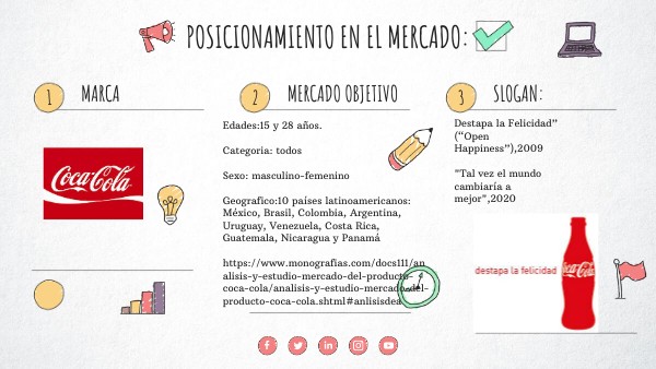 Edades:15 y 28 años.Categoria: todos Sexo: masculino-femenino Geografico:10 países latinoamericanos: México, Brasil, Colombia, Argentina, Uruguay, Venezuela, Costa Rica, Guatemala, Nicaragua y Panamá https://www.monografias.com/docs111/analisis-y-estudio-mercado-del-producto-coca-cola/analisis-y-estudio-mercado-del-producto-coca-cola.shtml#anlisisdea