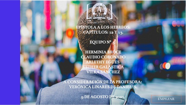 EPÍSTOLA A LOS HEBREOS:cAPÍTULOS: 12 Y 13.eQUIPO n° 5: HERMINIA BROCE CLAUDIO CORONADO aRLETHY EGÜes eSTHER GALÁSTICA VILKA SÁNCHEZ a CONSIDERACIÓN DE LA pROFESORA: VERÓNICA LINARES DE dANIEL´S. 9 DE AGOSTO DE 2021.