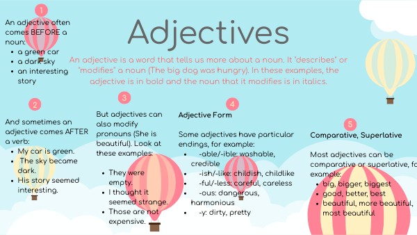An adjective is a word that tells us more about a noun. It "describes" or "modifies" a noun (The big dog was hungry). In these examples, the adjective is in bold and the noun that it modifies is in italics.