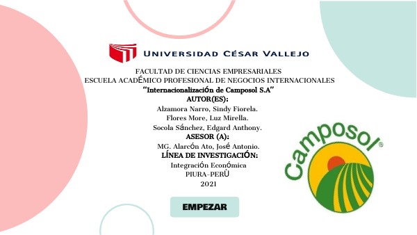 FACULTAD DE CIENCIAS EMPRESARIALES ESCUELA ACADÉMICO PROFESIONAL DE NEGOCIOS INTERNACIONALES “Internacionalización de Camposol S.A” AUTOR(ES): Alzamora Narro, Sindy Fiorela. Flores More, Luz Mirella. Socola Sánchez, Edgard Anthony. ASESOR (A): MG. Alarcón Ato, José Antonio. LÍNEA DE INVESTIGACIÓN: Integración Económica PIURA-PERÙ 2021