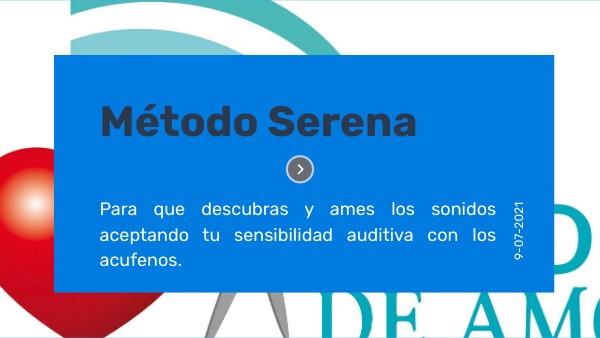 Desde hace doce años tengo acúfenos con una presión asociada, paso por la hiperacusia, una molestia excesiva a sonidos ambientales. Con mi perseverancia, resiliencia y persistencia logro volver a sentir los sonidos desde la calma y el amor aprendiendo a aceptar los desagradables, disfruto de los agradables y otros me son indiferentes, es decir, que les doy poca importancia. Gracias a un método "El berenjenal" que me escribí para mí misma surge el método "SERENA", un acompañamiento de cuatro meses con tres etapas donde logras seguridad y confianza en tí para descubrir y amar los sonidos con entusiasmo y tu ansiedad disminuye.