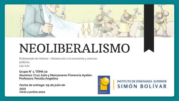 En el siguiente trabajo, trataremos sobre el Neoliberalismo, para entender de qué se trata, lo que propone como política económica.Además repasaremos como fue su surgimiento y su funcionamiento a través de las políticas en nuestro país, principalmente durante la época de la dictadura militar de 1976, entre otras fechas. Para finalizar, en base a lo investigado y aportado en esta presentación, compartiremos una breve conclusión respecto al Neoliberalismo.