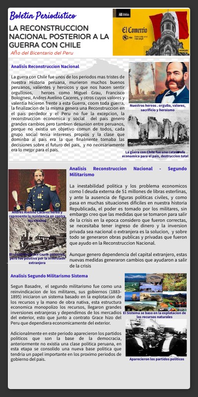 Analisis Reconstruccion Nacional La guera con Chile fue unos de los periodos mas tristes de nuestra Historia peruana, murieron muchos buenos peruanos, valientes y heroicos y que nos hacen sentir orgullosos, heroes como Miguel Grau, Francisco Bolognesi, Andres Avelino Caceres, y otros cuyos valores y valentia hicieron frente a esta Guerra, coom toda guerra, la finalizacion de la misma genera una Reconstruccion en el pais perdedor y el Peru no fue la excepcion, la reconstruccion economica y social del pais genero grandes cambios pero tambien desunion entre peruanos, porque no existia un objetivo comun de todos, cada grupo social tenia intereses propios y la clase que dominba al pais era la que finalmente tomaba las decisiones sobre el futuro del pais, y no necesariamente era lo mejpr para el pais.