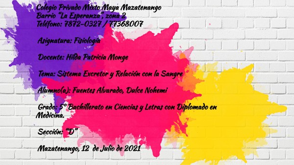 Colegio Privado Mixto Maya Mazatenango Barrio “La Esperanza”, zona 2 Teléfono: 7872-0327 / 77368007 Asignatura: Fisiología Docente: Hilda Patricia Monge Tema: Sistema Excretor y Relación con la Sangre Alumno(a): Fuentes Alvarado, Dulce Nohemi Grado: 5° Bachillerato en Ciencias y Letras con Diplomado en Medicina. Sección: “D” Mazatenango, 12 de Julio de 2021
