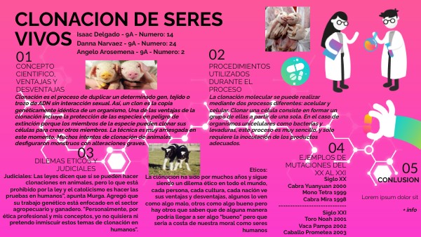 Eticos:La clonación ha sido por muchos años y sigue siendo un dilema ético en todo el mundo, cada persona, cada cultura, cada nación ve sus ventajas y desventajas, algunos lo ven como algo malo, otros como algo bueno pero hay otros que saben que de alguna manera podría llegar a ser algo “bueno” pero que seria a costa de nuestra moral como seres humanos