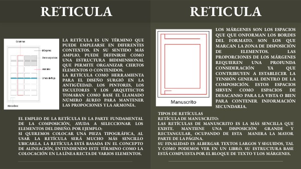TIPOS DE RETÍCULASRETÍCULA DE MANUSCRITO:LAS RETÍCULAS DE MANUSCRITO ES LA MÁS SENCILLA QUE EXISTE. MANTIENE UNA DISPOSICIÓN GRANDE Y RECTANGULAR, OCUPANDO DE ESTA MANERA LA MAYOR PARTE DE LA PÁGINA. SU FINALIDAD ES ALBERGAR TEXTOS LARGOS Y SEGUIDOS, TAL Y COMO PODEMOS VER EN UN LIBRO. SU ESTRUCTURA BASE ESTÁ COMPUESTA POR EL BLOQUE DE TEXTO Y LOS MÁRGENES.